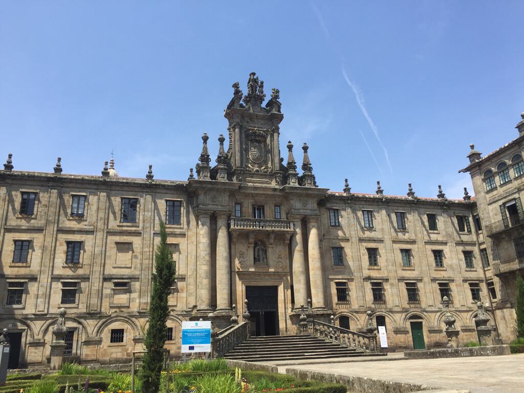 Bis jetzt sind wir den ganzen Tag auf Achse gewesen und haben doch wenig gemacht. Nach der Pilgermesse kurzes Frühstück in der Wohnung, die wir dann verliessen. Glücklicherweise konnten wir in San Martin Pinario sofort einchecken und mussten nicht warten. Das Bild zeigt das Priesterseminar. Das Hotel ist der Westflügel Links. Anschliessend Stadtbummel zum Bahnhof. Mit dem Bus zum Flughafen. Dort wurde unsere Geduld auf eine harte Probe gestellt. Ein Ehepaar wollte sich ein Auto mieten und diskutierte jedwede Option akribisch (Navi, Diesel, …….). Offensichtlich überfordert mit den vielen Möglichkeiten dauerte der Mietvorgang über 45 Minuten, wobei die Einführung in das Navi die Kollegen vom Checkout übernahmen. Als wir unseren Wagen aus der Garage fuhren waren die beiden noch lange nicht fertig. Dafür wurden wir mit einem guten Mittagessen entschädigt. Leider kommen Christianes Eltern erst um Mitternacht an. Wegen Verspätung ab FFM verpassten sie den Anschlussflug in Madrid. Das wird eine kurze Nacht. Ch&kh